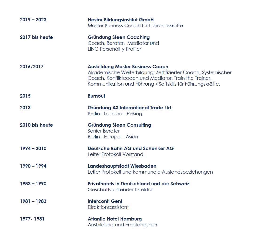 Nach einem Total-Kollaps und monatelanger Reha Behandlung war die Rückkehr in den Beruf für mich alles andere als einfach – ich wusste nicht so recht, was, wohin und wie ich es anfangen soll. Das Coaching durch Herrn Steen, verbunden mit einer Mediation für meine Familie und mich, hat mir bei meiner beruflichen und privaten Neuorientierung sehr geholfen.